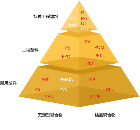 工程塑料一般是指可以作為結構材料承受機械應力,能在較寬的溫度范圍和較為苛刻的化學及物理環境中使用的塑料材料。工程塑料可分為通用工程塑料和特種工程塑料兩大類。通用工程塑料通常是指已大規模工業化生產的、應用范圍較廣的5種塑料,即聚酰胺(尼龍,PA)、聚碳酸酯(聚碳,PC)、聚甲醛(POM)、聚酯(主要是PBT)及聚苯醚(PPO)。而特種工程塑料則是指性能更加優異獨特,但目前大部分尚未大規模工業化生產或生產規模較小、用途相對較窄的一些塑料,如聚苯硫醚(PPS)、聚酰亞胺(PI)、聚砜(PSF)、聚醚酮(PEK)、液晶聚合物(LCP)等。 工程塑料性能優良,可替代金屬作結構材料,因而被廣泛用于電子電氣、交通運輸、機械設備及日常生活用品等領域,在國民經濟中的地位日益顯著。